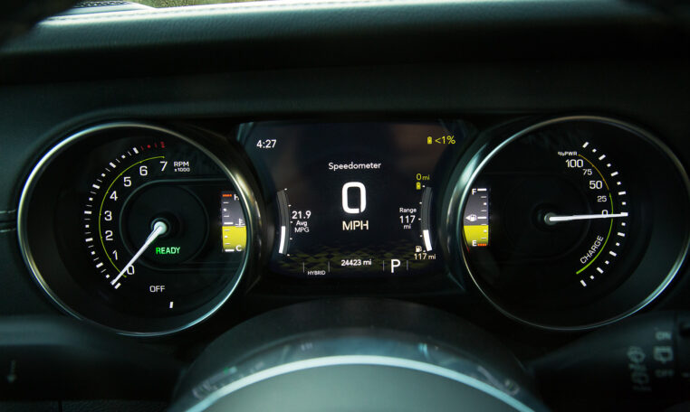 The Wrangler 4xe offers an EPA-rated 49 MPGe when using electric and gas power together. Drivers can travel up to 21 miles on electric power alone, making it ideal for short commutes and city driving. When the battery runs low, the vehicle seamlessly switches to gasoline power without interrupting the drive.